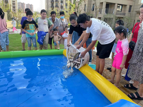 2022年8月13日,豐樂·嘉山印在社區(qū)內(nèi)部中心景觀涼亭舉行了真人捕魚達(dá)人活動,邀請了新老業(yè)主客戶及眾多兒童到場,活動設(shè)置了多個獎項,同時為來訪簽到的客戶,發(fā)放了伴手禮,現(xiàn)場還設(shè)置了冷餐臺,有糕點、水果、冷飲等冷餐,來訪客戶可自由品嘗。